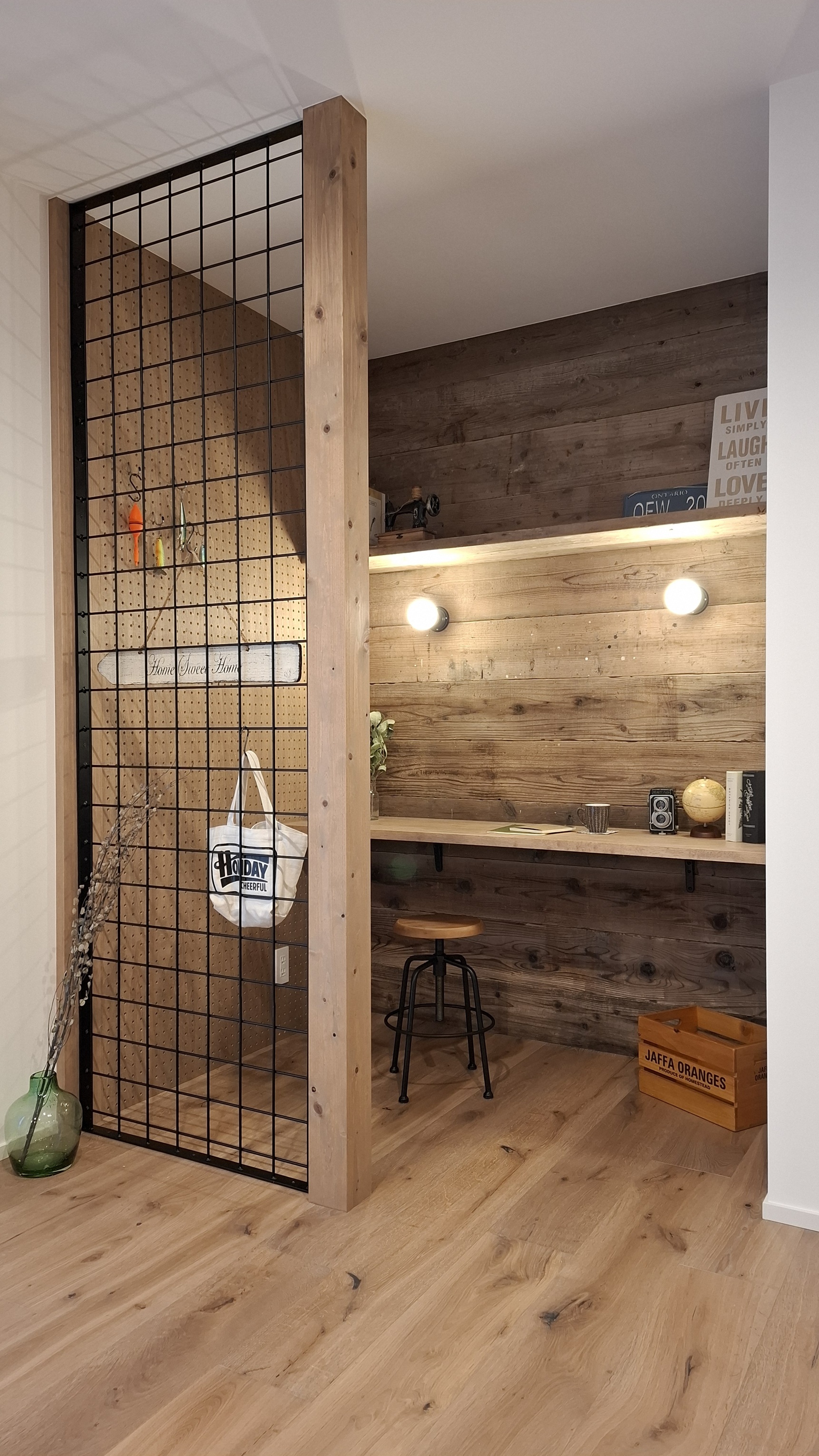 リビングのコーナーには、古材を使ったワイルドな印象のワークスペースを造作しました。