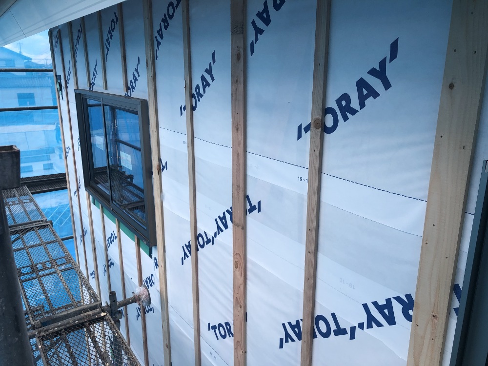 内部には断熱材を隙間無くしっかりと施工し、更に室内側に気密シートを施工していきます。この工程で室内結露が壁内で起きないようにしていきます。