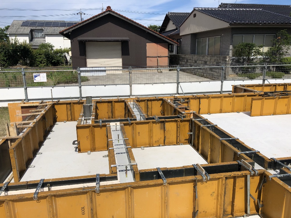 基礎外周の立ち上がり部分に、外部にコンクリートが漏れ出さないように、型枠を組んでいく工程です。